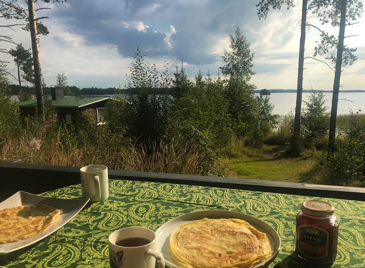 Brokastu plānajām pankūkām galdu klāju uz namiņa terases, lai varam izbaudīt skatu uz burvīgo ezera un priežu meža ainavu, kas šorīt, šķiet, pieder mums vieniem. Vērojam, kā ezerā cēli peld gulbju ģimene.