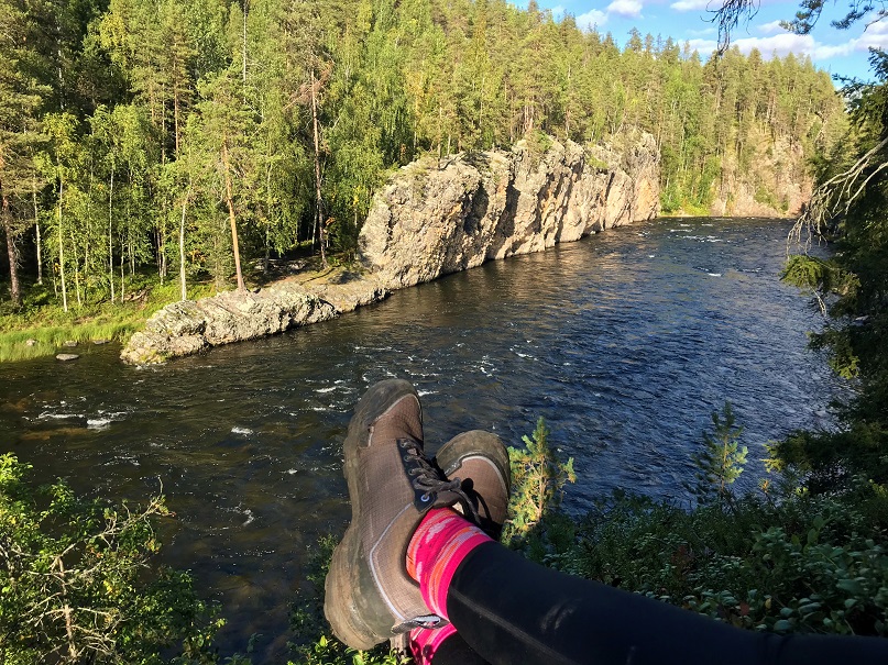 Šeit ir patiešām iespaidīgi skati uz Oulankajoki upi, kas izgrauzusi sev ceļu sārtajās klintīs. Vērojam, kā upe baltiem putu mutuļiem gāžas lejup pa akmeņu krācēm. Šī pagaidām ir iespaidīgākā skatu vieta līdz šim noietajā Lielā Lāča takas posmā.
